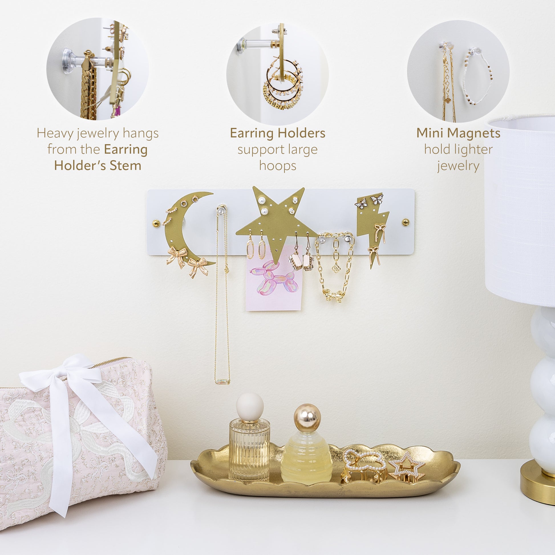 Organize your jewelry so it is easy to see and access at a glance. CK Organizers' minimalist wall-mounted jewelry organizer stores your jewelry in a new and different way using magnets. The magnetic jewelry holders attach to a luxe, sleek, high-gloss glaze over a metal surface that doubles as a memo board. Hold your notes, photos, postcards, and more alongside your jewelry.